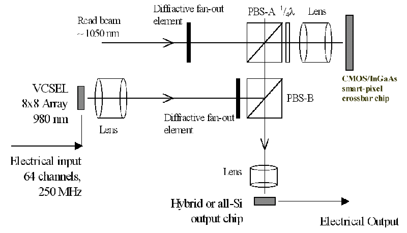 A major task of the switching chip is to resolve contention problems. This can be conveniently done within the area of each fan-in group with the required buffering included by the addition of memory in parallel to the output. Sufficient space should be available to include this on the IC, provided 0.7 mm CMOS (or BiCMOS) is used. An alternative approach to buffering could be to add one or two additional outputs (i.e. with extra modulators on the opto-chip) and include matching memory and multiplexers on the final output chip. Note that, provided the lenses are appropriately designed, the input wavelength need not be the same wavelength as the output. In fact different wavelengths could be used to advantage to minimise losses on the beam-splitters. It follows that the input VCSEL array could be 980 nm while the modulators operate at, say 1064 nm. Alternatively, 850 nm VCSELs could be used with 980 nm modulators in conjunction with removal (or preferably thinning) of the GaAs substrate of the switching chip. The philosophy underlying this design is the use of a 2-D array structure to create a scalable switch. The signals are grouped in close proximity to the corresponding output channels. Consequently the distance travelled to an (optical) output scales as logN, rather than N, which would be the case for electrical edge connections. The problem of supplying all the necessary inputs to each fan-in group is solved by employing an optical fan-out – a distributed connection task that is particularly well suited to optics. Another aspect that requires attention is the overall size of this experimental system. Using the optomechanical assembly techniques that we have already developed, we currently anticipate a footprint of about 15cm×10cm – comparable to the size of small board. However we shall be seeking further size reductions, for example, by the use of graded-index lenses. The above details represent our current thinking. Clearly better alternatives will be considered as work progresses. For example, the use of VCSELs in place of the modulators, will be assessed. However, the design as outlined can be implemented with a combination of techniques that are either already available to the SPOEC consortium or can be developed at the early stages of the project. It therefore represents a baseline demonstrator system. |