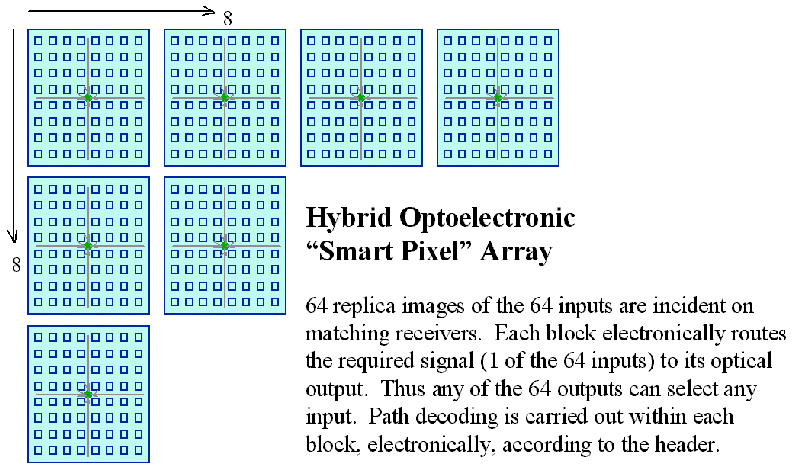 The crossbar switch that we envisage constructing is shown schematically in figure 2 and figure 3. Data is presented, in parallel, in the form of 64 optical signals in a square array – ideally from an 8×8 VCSEL array or, if preferred, through an array of optical fibres. Diffractive optics [7], [8] replicate this set of inputs 64 times across the area of the smart pixel array. This latter, illustrated in figure 3, comprises 4,096 detectors (InGaAs pin MQW photodiode) solder-bump coupled to the underlying silicon IC. The silicon is broken up into 64 identical areas, each receiving the full set of inputs as well as feeding one of the possible output channels. As each signal arrives the 6-bit header is decoded and if it matches the destination fed by that fan-in group it is directed to the (optical) output – a modulator on the optoelectronic chip (InGaAs pin MQW electro-absorption). Thus there are a total of 64 optical (modulator) outputs configured, once again, as an 8×8 array. These modulators are read by a corresponding set of beams, derived from a separate laser, which are reflected from this opto-chip and then passed to the final detector array (or possibly output fibres). This detector array – which would again be based on the same hybrid InGaAs/Si construction – outputs the 64 channels in the required electrical format. (Note that this is a much easier task than attempting to drive signals directly off the edge of the considerably larger, and more dense, switching chip.)